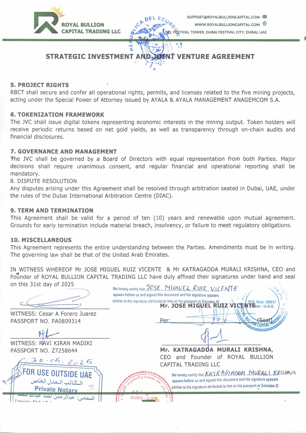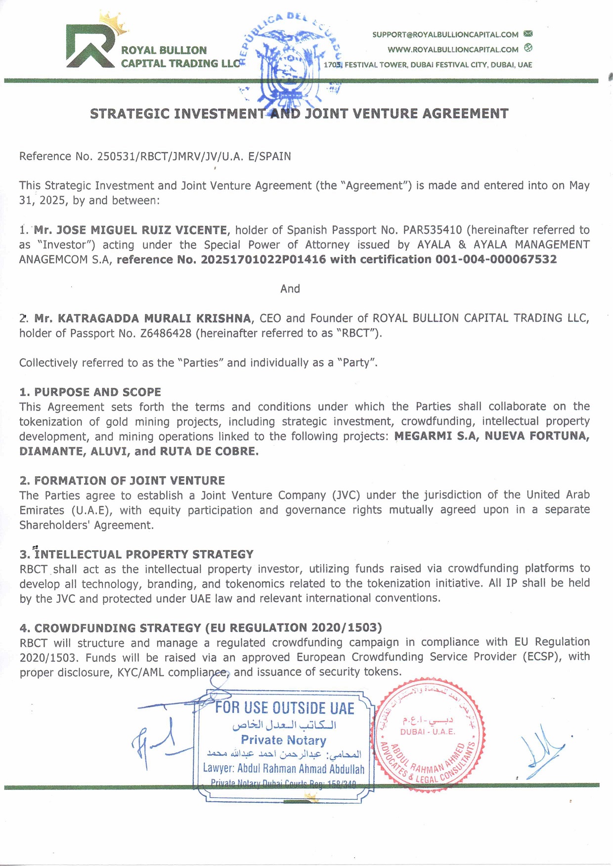 - We are proud to announce a landmark Strategic Investment and Joint Venture Agreement executed on May 31, 2025, with AYALA & AYALA MANAGEMENT ANAGEMCOM S.A. This pivotal agreement, referenced as 250531/RBCT/JMRV/UAE/ESPAIN, marks a significant milestone in our journey to redefine gold mining through tokenization and sustainable development.